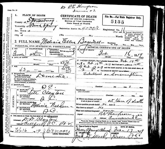 Malisia Ellen Clayton was also known as Melisia Ellen Clayton. She was born on 17 June 1876 in Spartanburg County, South Carolina.1 As of after 1900,her married name was Bagwell.1 She married James Perry Bagwell, son of Willis Marion Bagwell and Julia Amanda Lynch, after 1900.1 Malisia Ellen Clayton died on 16 February 1919 in Campobello, Spartanburg County, South Carolina, at age 42 of Pulmonary tuberculosis, historically known as "consumption" due to the rapid weight loss and "wasting away" it caused.1 She was buried on 17 February 1919 at Holly Springs Baptist Church Cemetery, Inman, Spartanburg County, South Carolina.1