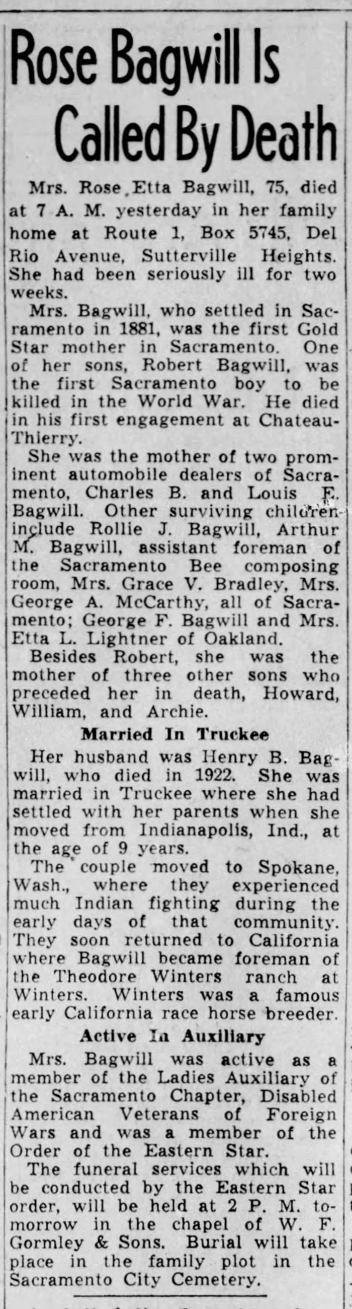 Arthur McKinley Bagwill was born on 28 March 1897 in Sacramento, Sacramento County, California. He was the son of Henry Bryant Bagwell and Rosa Etta Newkirk. Arthur McKinley Bagwill married Fern Priscilla McSweeney in 1921 at Sacramento County, California. Arthur McKinley Bagwill married Lena Clemential Radich in September 1955 at Sacramento County, California. Arthur McKinley Bagwill died on 8 February 1971 in Sacramento, Sacremento County, California, at age 73. He was buried at Saint Marys Catholic Cemetery and Mausoleum, Sacramento, Sacremento County, California.