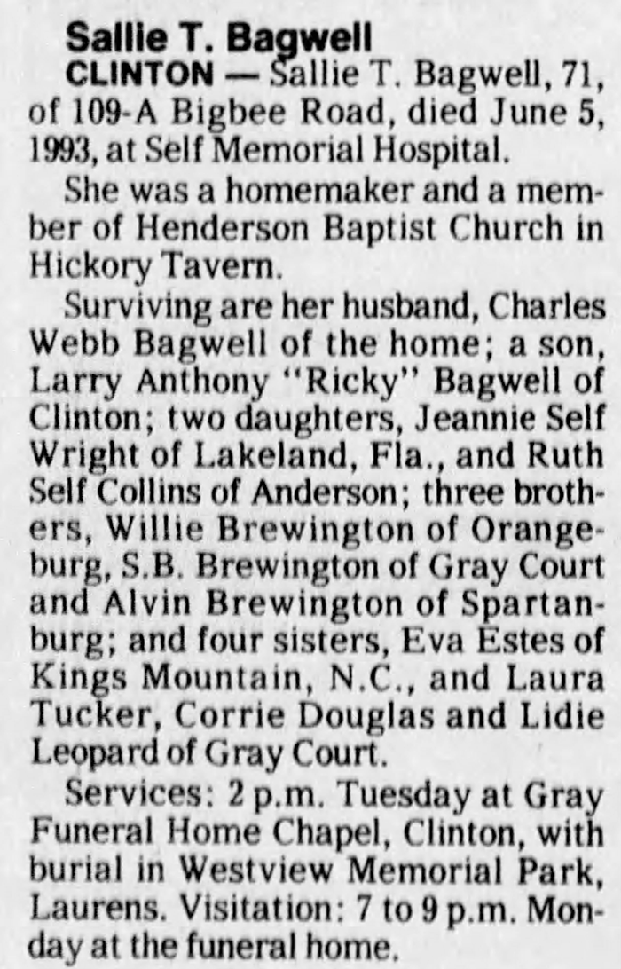 Sallie Tucker was born on 9 February 1922. As of 7 June 1946,her married name was Bagwell. She married Charles Webb Bagwell, son of Luther Broadus Bagwell and Sallie Bell Davis, on 7 June 1946. Sallie Tucker died on 5 June 1993 in Self Memorial Hospital, Greenville, South Carolina, at age 71. She was buried on 8 June 1993 at Westview Memorial Park, Laurens, Laurens County, South Carolina.