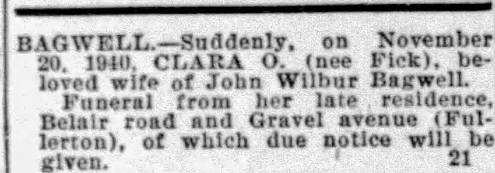 Clara Olivia (Fick) Bagwell - Obituary