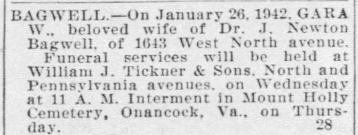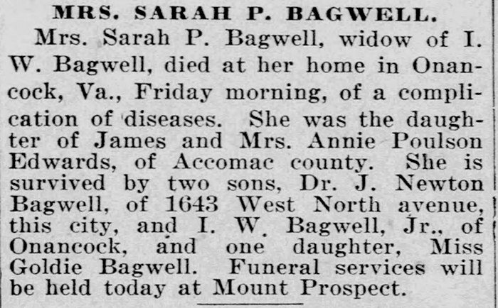 Dr. James Newton Bagwell was born on 8 July 1877 in Onancock, Accomack County, Virginia.1,2 He was the son of Isaiah William Bagwell and Sarah Poulson Edwards. James Newton was a dentist, having graduated from the Baltimore College of Dental Surgery. He lived in Pocomake City, Maryland for a couple of years, then returned to Baltimore where he spent the rest of his life. He had attended a business school Poughkeepsie, New York before entering Baltimore College of Dental Surgery. He married Dr. A. K. Garaphelia "Gara" Wareheim on 8 March 1900. Dr. James Newton Bagwell lived in 1907 in Baltimore, Maryland. He died on 9 February 1947 in Baltimore, Maryland, at age 69.1,2 He was buried at Mount Holly Cemetery, Onancock, Accomack County, Virginia.2