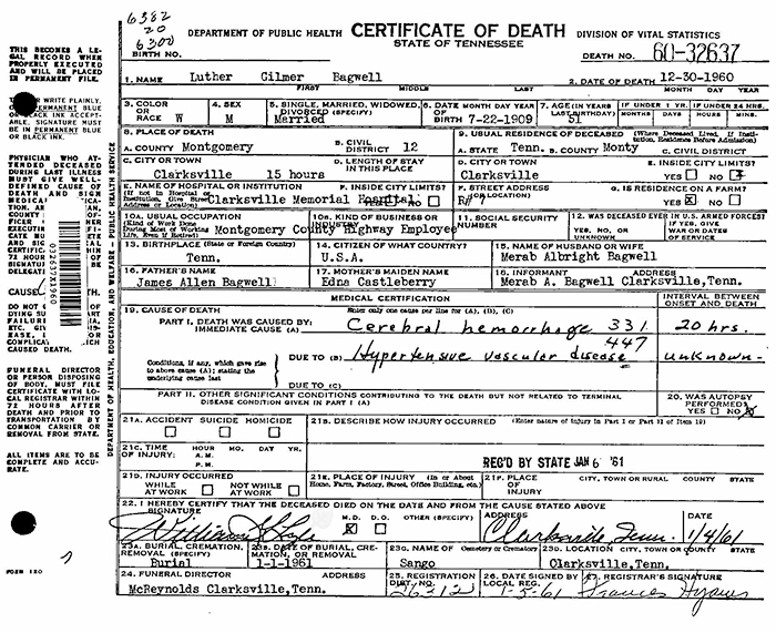 Luther Gilmer Bagwell was also known as Gilmer Luther Bagwell. He was born on 22 July 1909 in Clarksville, Montgomery County, Tennessee.1 He was the son of James Allen Bagwell and Lucy Edwina Castleberry. Luther Gilmer Bagwell married Merab Mayze Albright after 1925.2 Luther Gilmer Bagwell died on 30 December 1960 in Clarksville, Montgomery County, Tennessee, at age 51.1 He was buried at Sango Cemetery, Sango, Montgomery County, Tennessee.1