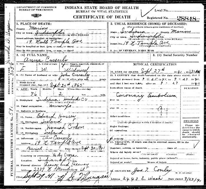Anna Hussey was born on 25 September 1864 in Hendricks County, Indiana. She married John Casserly, son of Timothy Casserly and Catherine Dugan, on 3 March 1886. Anna Hussey died on 27 September 1941 in Indianapolis, Marion County, Indiana, at age 77. She was buried on 30 September 1941 at Holy Cross and Saint Joseph Cemetery, Indianapolis, Marion County, Indiana.