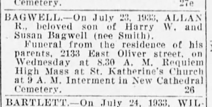 Allan R. Bagwell was born on 2 August 1906 in Baltimore City, Maryland.1 He was the son of Harry Worthington Bagwell and Susan Veronica Smith.1 Allan R. Bagwell died on 23 July 1933 in Baltimore City, Maryland, at age 26.1 He was buried on 26 July 1933 at New Cathedral Cemetery, Baltimore, Baltimore City, Maryland.1