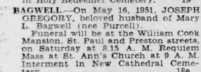 Joseph Gregory Bagwell was born on 9 January 1886 in Baltimore City, Maryland.1 He was the son of John Wise Bagwell and Mary Ann Connelly. Joseph Gregory Bagwell married Mary Lucia Purcell in 1914. Joseph Gregory Bagwell died on 16 May 1951 in Baltimore City, Maryland, at age 65.1 He was buried at New Cathedral Cemetery, Baltimore, Baltimore City, Maryland.1