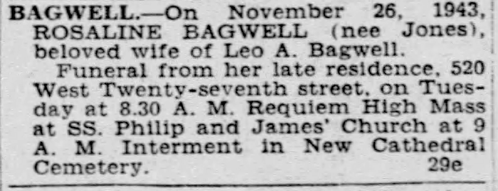 Leo Aloysius Bagwell was born on 27 September 1878 in Maryland.1 He was the son of John Wise Bagwell and Mary Ann Connelly. Leo Aloysius Bagwell married Rosaline Jones in 1901.2 Leo Aloysius Bagwell died on 11 January 1948 in Baltimore City, Maryland, at age 69.1 He was buried at New Cathedral Cemetery, Baltimore, Baltimore City, Maryland.1