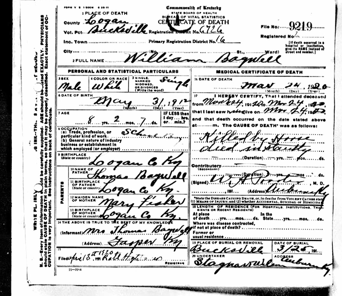William Bagwell was born on 31 May 1912 in Logan County, Kentucky.1 He was the son of Thomas Lee Bagwell and Mary Elizabeth Fisher.1 William Bagwell died on 24 March 1920 in Bucksville, Logan County, Kentucky, at age 7 by horse; died instantly.1 He was buried at Bucksville Cemetery, Gasper, Logan County, Kentucky.1