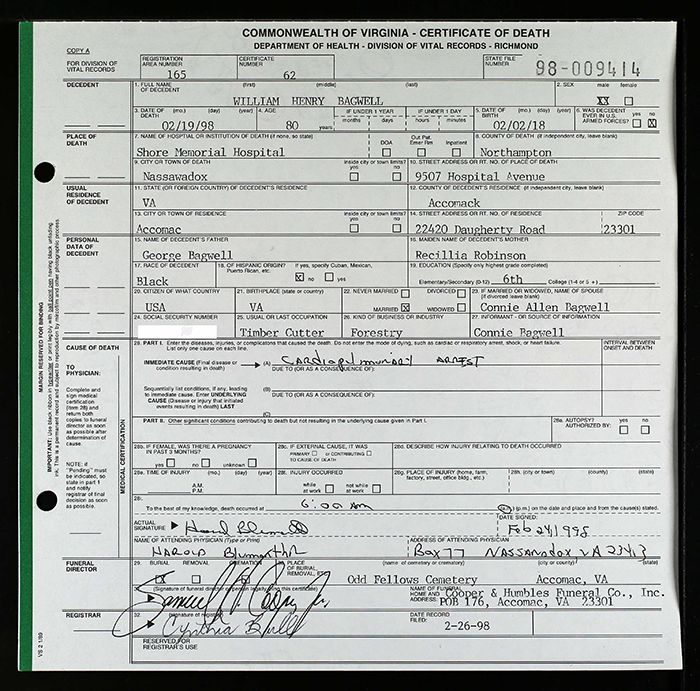 Charlie V. Bagwell was also known as Charlie Benjamin Bagwell. He was born on 12 August 1915 in Accomack County, Virginia. He was the son of George Plez Bagwell and Racilla Robinson. Charlie V. Bagwell married Lottie (?) after 1934. Charlie V. Bagwell died on 31 July 1986 in Pocomoke City, Worcester County, Maryland, at age 70. He was buried on 7 August 1986 at Tindley Memorial Park Cemetery, Maryland.
