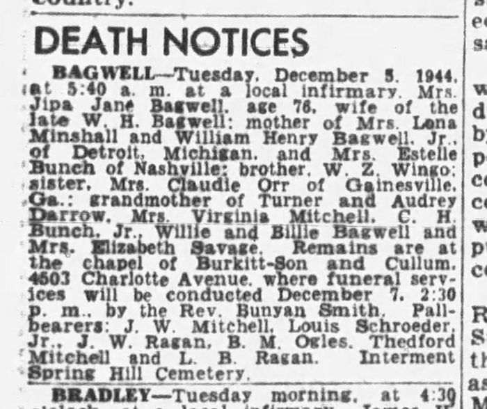 Jippa Jane Wingo was born on 14 June 1868 in Gainesville, Hall County, Georgia.1 As of 5 December 1886,her married name was Bagwell. She married William Henry Bagwell, son of William Bagwell and Martha A. Blackstock, on 5 December 1886 at Hall County, Georgia. Jippa Jane Wingo died on 5 December 1944 in Nashville, Davidson County, Tennessee, at age 76