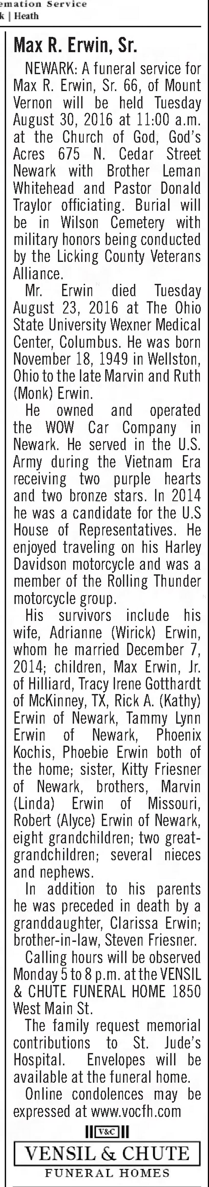 Max Russell Erwin was born on 18 November 1949 in Wellston, Ohio. He married Virginia Gale Bagwill, daughter of Paul Dwight Bagwill and Irene Bowers, on 1 January 1971 at Collin County, Texas. Max Russell Erwin married Virginia Gale Bagwill, daughter of Paul Dwight Bagwill and Irene Bowers, on 20 October 1971 at Collin County, Texas. Max Russell Erwin and Virginia Gale Bagwill were divorced on 8 August 1977 at Licking County, Ohio.1 Max Russell Erwin died on 23 August 2016 in Ohio State University Medical Center, Columbus, Ohio, at age 66. He was buried on 30 August 2016 at Wilson Cemetery, Newark, Licking County, Ohio.