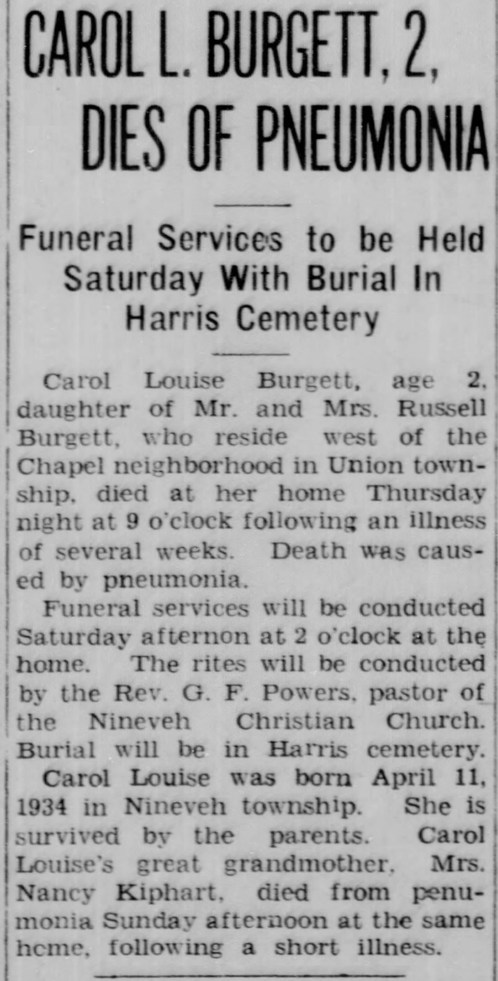 Clarissa Elizabeth McFadden was born on 18 June 1858 in Johnson County, Indiana. As of 18 March 1875,her married name was Burgett. She married James Valentine Burgett, son of Valentine Burgett and Nancy Keaton, on 18 March 1875 at Johnson County, Indiana. Clarissa Elizabeth McFadden died on 5 March 1892 in Johnson County, Indiana, at age 33. She was buried at Nineveh Christian Church Cemetery, Nineveh, Johnson County, Indiana.