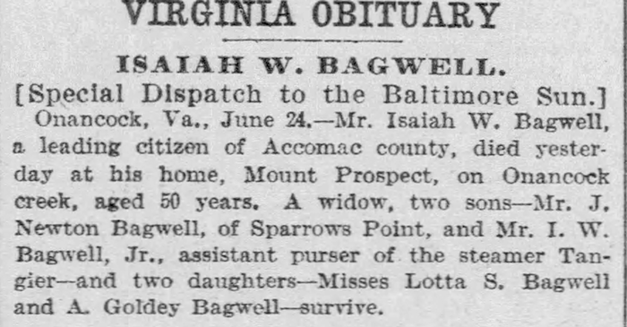 To wife Peggy Bagwell the plantation on which I now reside containing 100 acres. To my half-sister Sarah Poulson the house in which she now lives with 3 acres. To my wife Peggy Bagwell the remainder part of the tract given to my sister Sarah, the whole tract containing 25 acres bounded by the county road on the west, lands of Abel Garrison on the north. Upon wife's death to brother Isaiah Bagwell the aforesaid tract of land containing 25 acres & he is to pay George Poulson, son of my sister Sarah Poulson, $100. To brother Isaiah Bagwell, at the death of my wife, the land where I now live & if he dies without issue, then to brother George Bagwell. To brother Isaiah Bagwell all my land on Cedar Island. To wife Peggy the store house & lot containing 9 acres called Stewart's Store lying on the westward side of the Sea Side county road near the head of Wachapreague. To brother George P. Bagwell the land bounded on the west by the land of Southey Bloxom & the east by the land of Susannah Wharton & John Wharton containing 90 acres & out of this I lend 5 acres to Moses London & Esther his wife & at their death to brother George P. Bagwell. Brother George to pay my sister Sarah Poulson annually for 5 years 3 barrels of Indian corn. To wife the term of service to be completed of Moses London agreeable to the deed of manumission on record & he is to go free if my wife dies before such term & also to wife my black girl Leah & at wife's death Leah to be free. To sisters Elizabeth Jones Wise, wife of George E. Wise of Nansemond, & Sarah Poulson £50 each. To Ezar Poulson, son of George Poulson, £3 & also to Esther Sampson, Daniel Sampson & Jacob Sampson, black people who I manumitted, each £3 to be paid out of the store. To my nephew William Bagwell ... The residue to wife Peggy, except the $100 which I give to the Bishops of the Methodist Church in the United States. Brothers Isaiah & George Bagwell Extrs. Witt: John Wise, Major Budd, Keziah Bundick, Abel Garrison, Aser Shield & James Shield. He died on 17 May 1816 at age 58.1