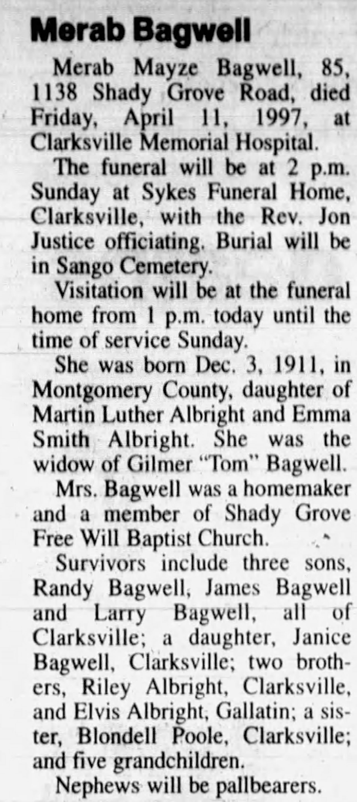 Merab Mayze Albright was also known as Mexab Albright. She was born on 3 December 1911 in Montgomery County, Tennessee.1 She married Luther Gilmer Bagwell, son of James Allen Bagwell and Lucy Edwina Castleberry, after 1925.1 Merab Mayze Albright was buried at Sango Cemetery, Sango, Montgomery County, Tennessee.1 She died on 11 April 1997 in Montgomery County, Tennessee, at age 85. She was buried at Sango Cemetery, Sango, Montgomery County, Tennessee.