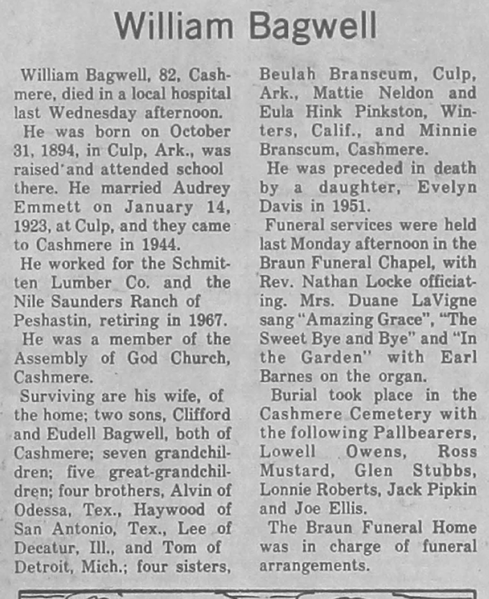 William Shelby Bagwell was born on 31 October 1894 in Culp, Baxter County, Arkansas.1 He was the son of Jesse Marion Bagwell and Mary Ellen Whaley. William Shelby Bagwell married Hazel Galloway in 1915 at Arkansas. William Shelby Bagwell married Audrey Gertrude Emmett on 14 January 1923 at Culp, Baxter County, Arkansas. William Shelby Bagwell died on 17 November 1976 in Cashmere, Chelan County, Washington, at age 82.1 He was buried on 22 November 1976 at Cashmere Cemetery, Cashmere, Chelan County, Washington.1