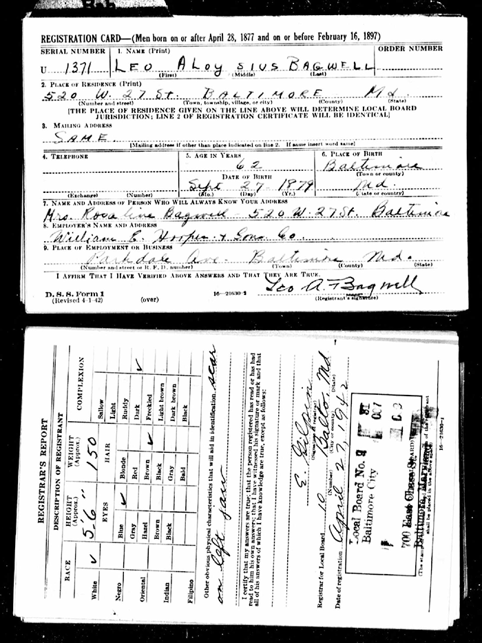 Leo Aloysius Bagwell was born on 27 September 1878 in Baltimore, Maryland.1 He was the son of John Wise Bagwell and Mary Ann Connelly. Leo Aloysius Bagwell married Rosaline Jones in 1901.2 Leo Aloysius Bagwell died on 11 January 1948 in Baltimore City, Maryland, at age 69.1 He was buried at New Cathedral Cemetery, Baltimore, Baltimore City, Maryland.1