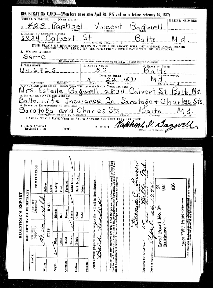 Raphael Vincent "Ray" Bagwell was born on 21 November 1889 in Baltimore City, Maryland.1 He was the son of John Wise Bagwell and Mary Ann Connelly. Raphael Vincent "Ray" Bagwell married A. Estelle Phillips after 1905.2 Raphael Vincent "Ray" Bagwell died on 4 March 1960 in Baltimore City, Maryland, at age 70.1 He was buried at New Cathedral Cemetery, Baltimore, Baltimore City, Maryland.1