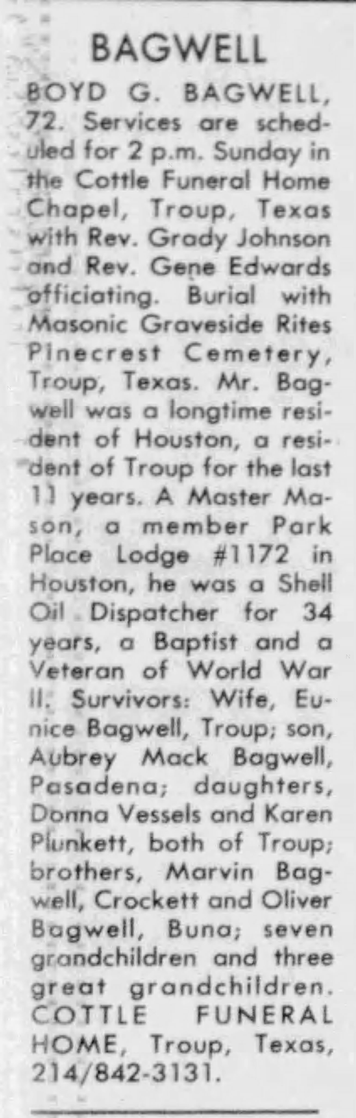 Boyd George Bagwell was born on 17 November 1915 in Iago, Wharton County, Texas.1,2 He was the son of Charles Wilburn Bagwell and Mary Elizabeth Turner.1 Boyd George Bagwell married Eunice Willa Bowdoin on 12 March 1937.1,3 Boyd George Bagwell died on 1 January 1988 in Troup, Smith County, Texas, at age 72.1,2 He was buried on 3 January 1988 at Pinecrest Cemetery, Troup, Smith County, Texas.2