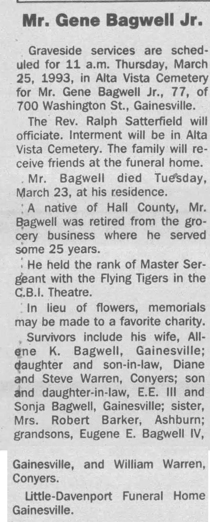 - Master Sergeant Eugene Edward Bagwell Jr.+1 b. 5 Jun 1915, d. 23 Mar 1993