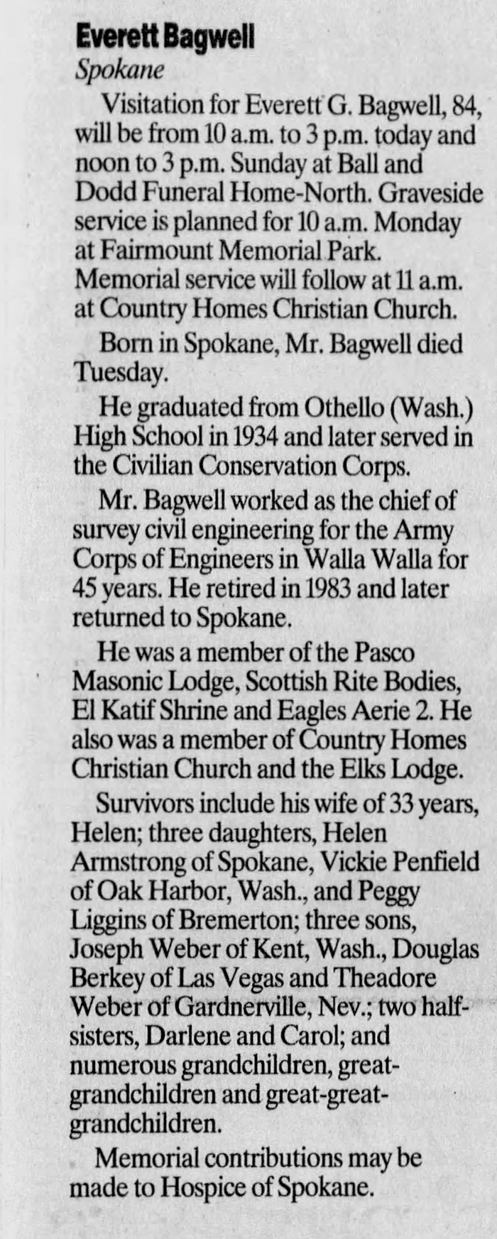 He is survived by a three daughters, Lois McKenna of East Wenatchee; Elizabeth Swift of Keno, Ore; and Sharon Bagwell of Wenatchee; a son, Dan Bagwell of Seattle; and a brother, Ervin Shipman of Port Orchard.