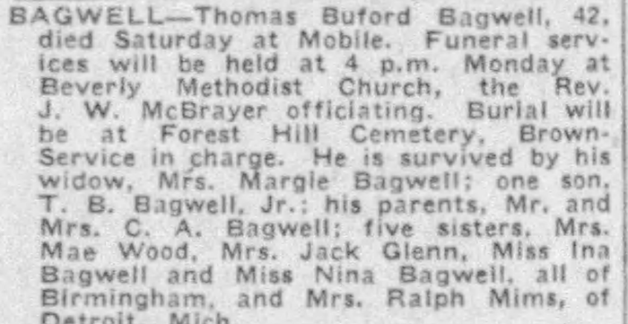 - Thomas Buford Bagwell+ b. 25 Mar 1901, d. 31 Jul 1943