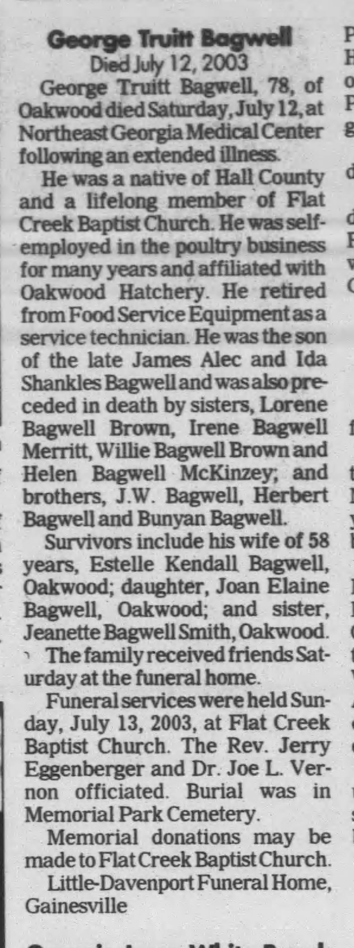 George Truitt Bagwell was born on 22 February 1925 in Hall County, Georgia.1 He was the son of James Alec Bagwell and Ida M. Shankles. George Truitt Bagwell married Estelle Kendall before 1951. George Truitt Bagwell died on 12 July 2003 in Northest Georgia Medical Center, Gainesville, Hall County, Georgia, at age 78.1 He was buried on 13 July 2003 at Memorial Park Cemetery and Columbarium, Gainesville, Hall County, Georgia.1