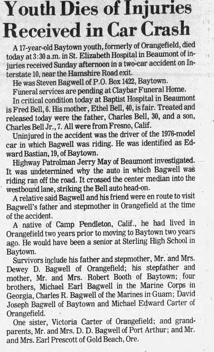 Steven C. Bagwell was born in 1961 in San Diego County, California.1,2 He was the son of Dewey Dwayne Bagwell and Phyllis Prescott.1 Steven C. Bagwell was buried on 21 August 1978 at Mary Williams Cemetery, Orangefield, Orange County, Texas.2 He died on 21 August 1978 in St. Elizabeth Hospital, Beaumont, Jefferson County, Texas, head injuries and internal bleeding as a result of a two-car headon collison.1