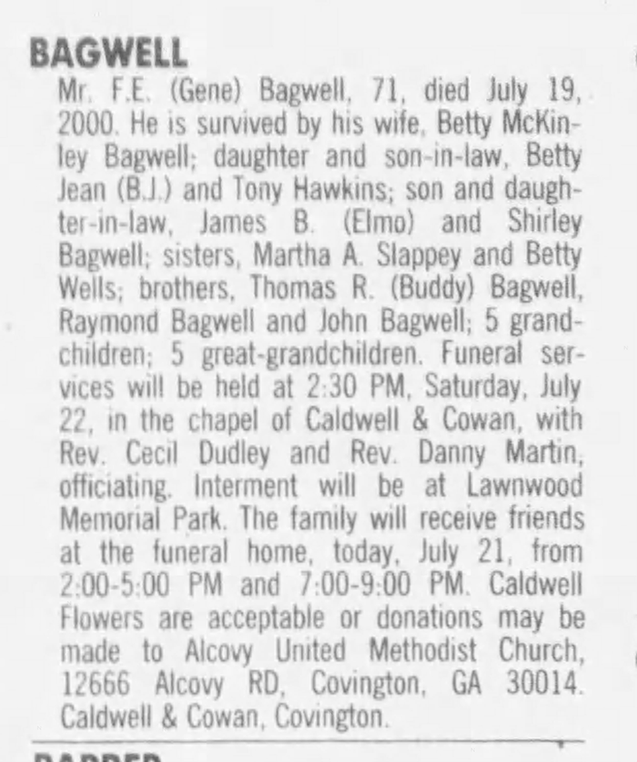 Forrest Eugene Bagwell was born on 27 September 1928 in DeKalb County, Georgia. He was the son of Forrest Buren Bagwell and Nellie Mae Hayes. Forrest Eugene Bagwell married Betty Julia Parker circa 1946. Forrest Eugene Bagwell died on 19 July 2000 in Covington, Newton County, Georgia, at age 71. He was buried on 22 July 2000 at Lawnwood Memorial Park, Covington, Newton County, Georgia.