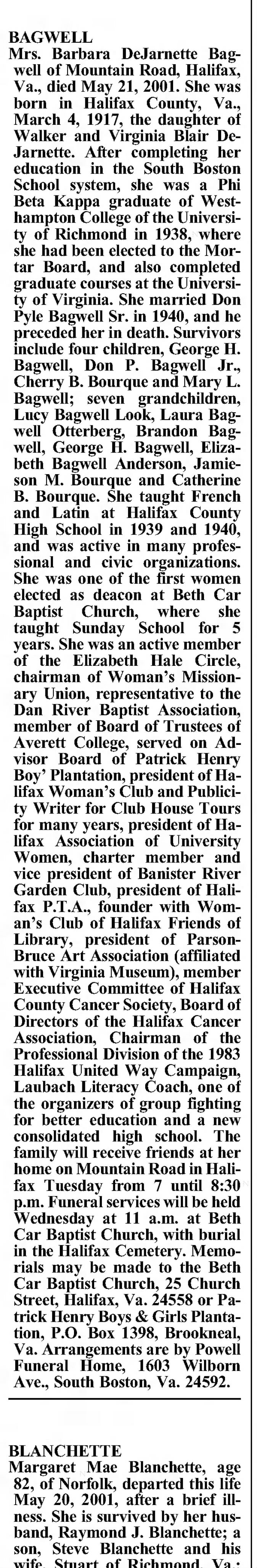 Barbara Blair DeJarnette was born on 4 March 1917.1 As of 12 September 1940,her married name was Bagwell. She married Don Pyle Bagwell, son of Reverend Robert Werner Bagwell and Emma Letitia Pyle, on 12 September 1940 at South Boston, Halifax County, Virginia. Barbara Blair DeJarnette died on 21 May 2001 at age 84. She was buried at Halifax Town Cemetery, Halifax, Halifax County, Virginia.1