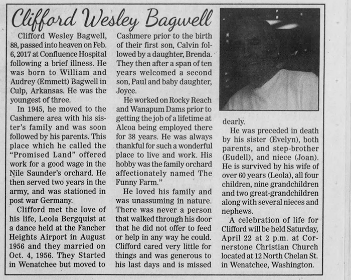 Clifford Wesley Bagwell was born on 23 April 1928 in Calico Rock, Arkansas.1 He was the son of William Shelby Bagwell and Audrey Gertrude Emmett. He served in the US Army. Clifford Wesley Bagwell lived on 23 April 1946 in Cashmere, Chelan County, Washington. He married Leola Berquist on 4 October 1956 at Washington. Clifford Wesley Bagwell died on 6 February 2017 in Wenatchee, Chelan County, Washington, at age 88