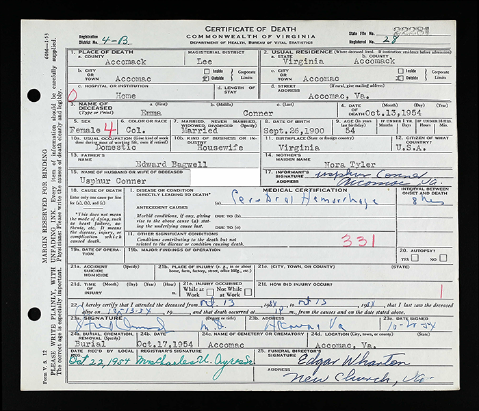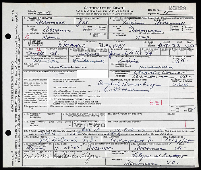 Emma Bagwell was also known as Charlotte Bagwell. She was born in January 1892 in Virginia Death certificate has her date of birth as September 26, 1900. She was the daughter of Edmund Bagwell and Eleanora "Nora" Tyler. As of 27 May 1917,her married name was Conner. Emma Bagwell married Upshur Lee Conner on 27 May 1917 at Accomack County, Virginia. Emma Bagwell died on 13 October 1954 in Accomac, Accomack County, Virginia, at age 62. She was buried on 17 October 1954 at Accomack County Cemetery, Accomac, Accomack County, Virginia.