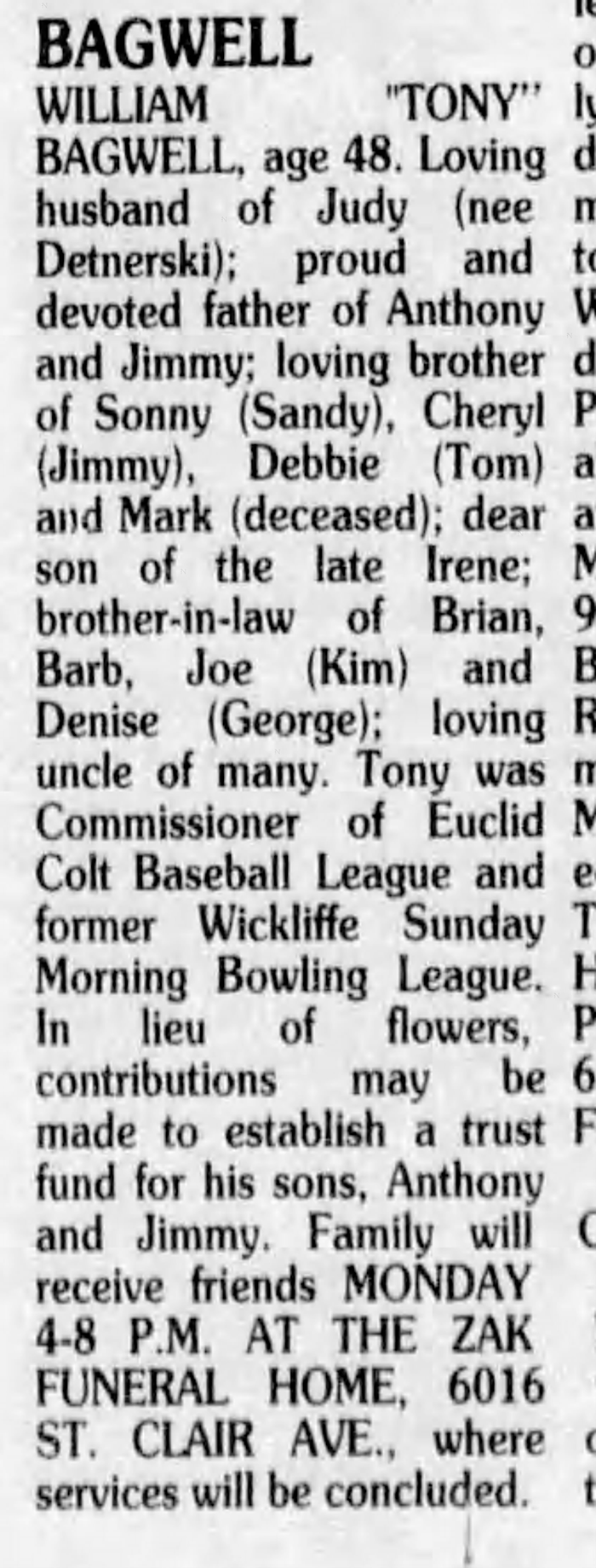 William Anthony Bagwell was born on 7 February 1959 in South Carolina. He was the son of Garnett Ralph Bagwell and Leila Irene Brown.1 William Anthony Bagwell married Christine Marie Werner before 1980 at Greenville, South Carolina. William Anthony Bagwell and Christine Marie Werner were divorced on 17 December 1980 at Euclid, Cuyahoga County, Ohio.1 William Anthony Bagwell lived in 1982 in Euclid, Ohio. He married Judith Marie Detnerski on 2 July 1983 at Ohio.1 William Anthony Bagwell died on 16 February 2007 in Cleveland, Ohio, at age 48.1