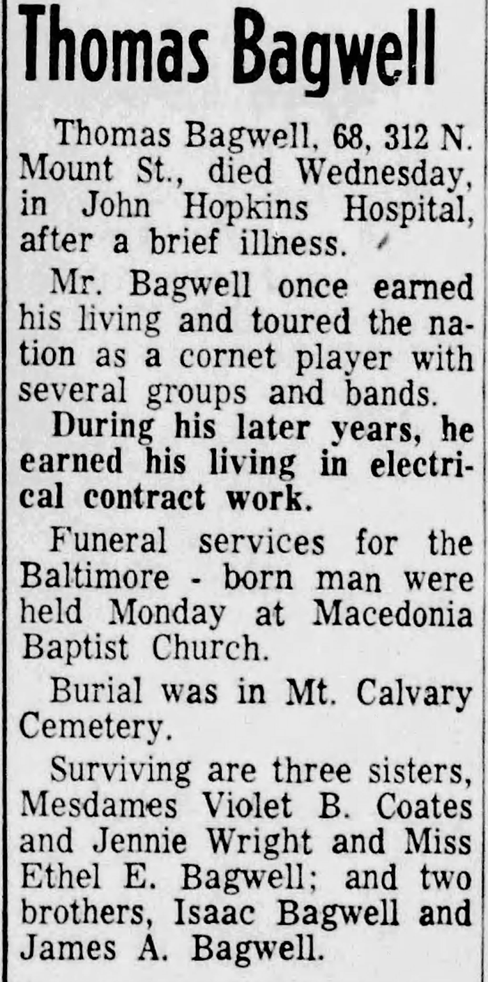 William Thomas Bagwell was also known as Thomas Bagwell. He was born on 3 September 1892 in Maryland. He was the son of Reverend Thomas A. Bagwell and Sarah E. Bourne. William Thomas Bagwell married Edith A. Goodwin after 1910. William Thomas Bagwell died on 7 August 1963 in John Hopkins Hospital, Baltimore, Maryland, at age 70. He was buried at Mt. Calvary Cemetery, Baltimore, Maryland.