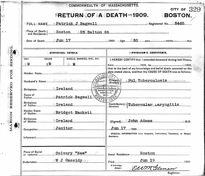 Patrick Bagwell was born in April 1827 in Ireland.1 He married Bridget Hackett circa 1860.1 Patrick Bagwell and Bridget Hackett lived on 12 June 1900 in Boston, Suffolk County, Massachusetts. Patrick Bagwell died on 14 April 1907 in Boston, Suffolk County, Massachusetts. He was buried on 17 April 1907 at Mount Calvary Cemetery, Roslindale, Suffolk County, Massachusetts.