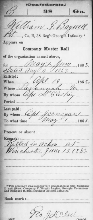 for William G. Bagwell, Private, Company B, 38 Regiment Georgia Infantry