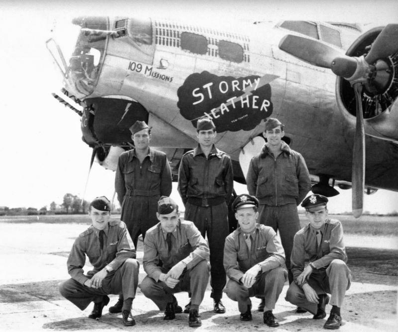 Front row: Lew Stuart (bombardier) Kenneth Bowie (co-pilot) Warren Herried (Pilot) Frank Corcoran (navigator) Back row: Houston Bagwell (flight enginerr), Ralph Dattolo (radio operator) and Bill Giffard (tail gunner)