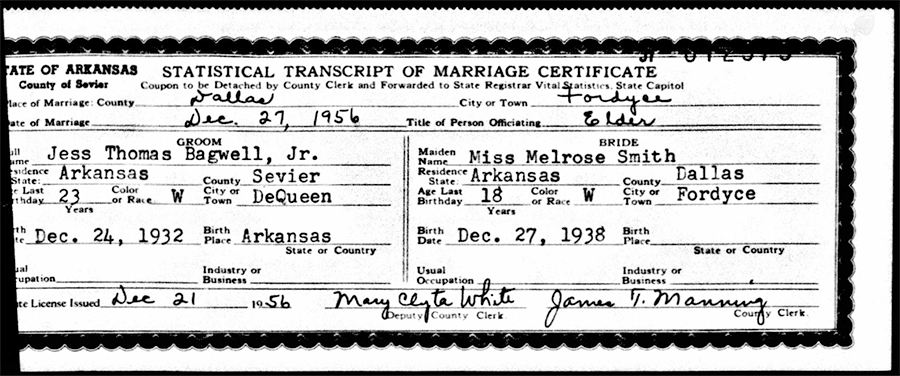 Certificate of Marriage for Jess Thomas Bagwell and Melrose Smith
