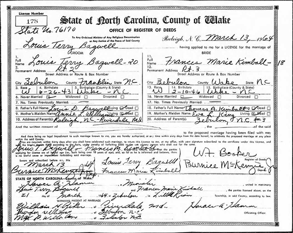Marriage License of Louis Terry Bagwell and Frances Marie Kimball