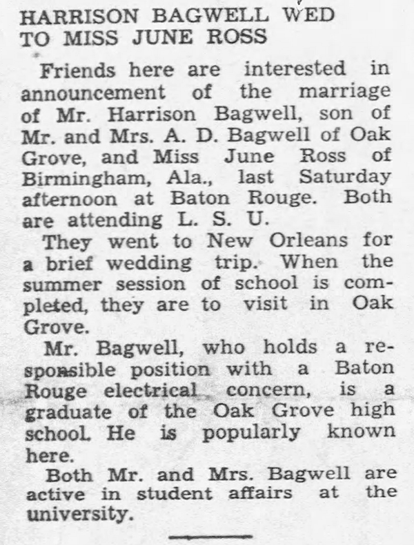 Harrison Garey Bagwell and June Ross - Marriage Annoucement
