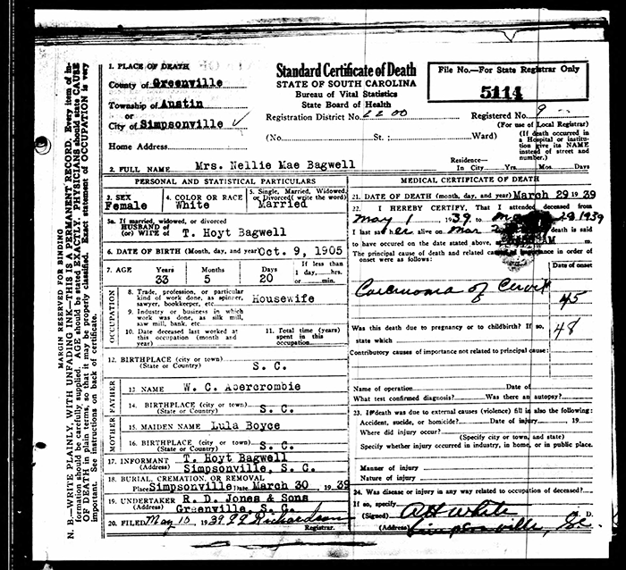 Nellie Mae (Abercrombie) Bagwell - Certificate of Death