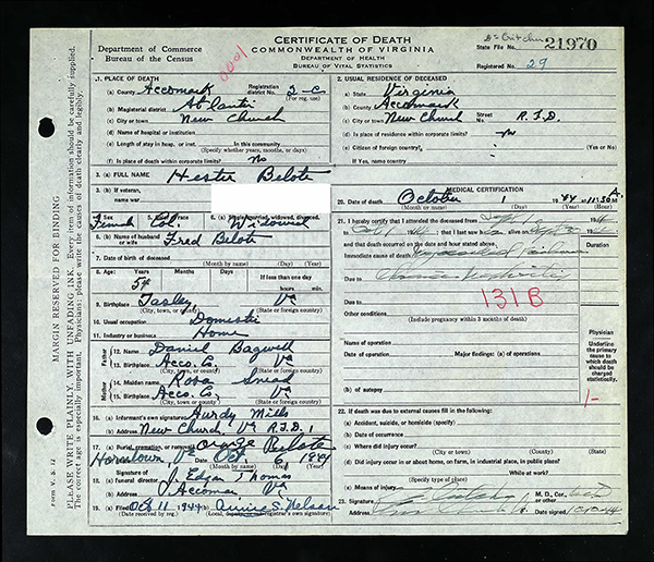 Certificate of Death, Commonwealth of Virginia