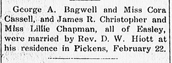 George Albert Bagwell and Cora Cassell - Marriage Annoucement