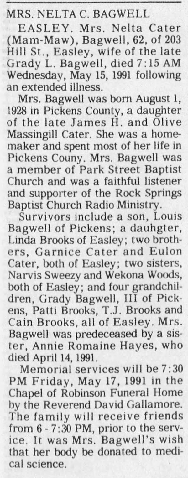 Nelta Gertrude (Cater) Bagwell - Obituary