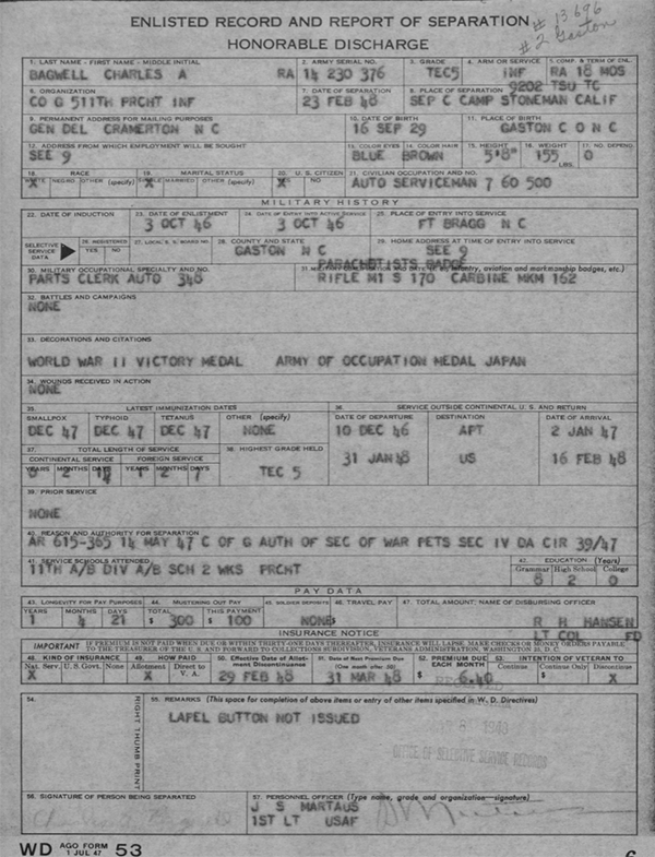 Charles Arthur Bagwell - Enlisted Record and Report of Seperation Honorable Discharge