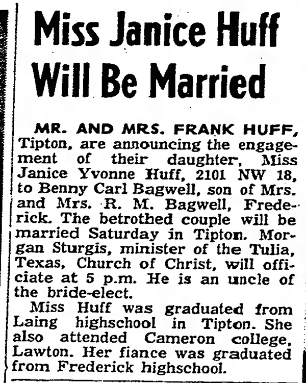 Benny Carl Bagwell and Janice Huff - Marriage Annoucement