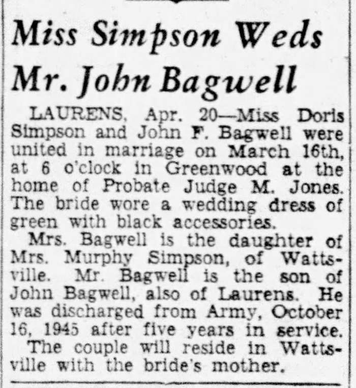 John Thomas Bagwell and Doris Simpson - Marriage Annoucement
