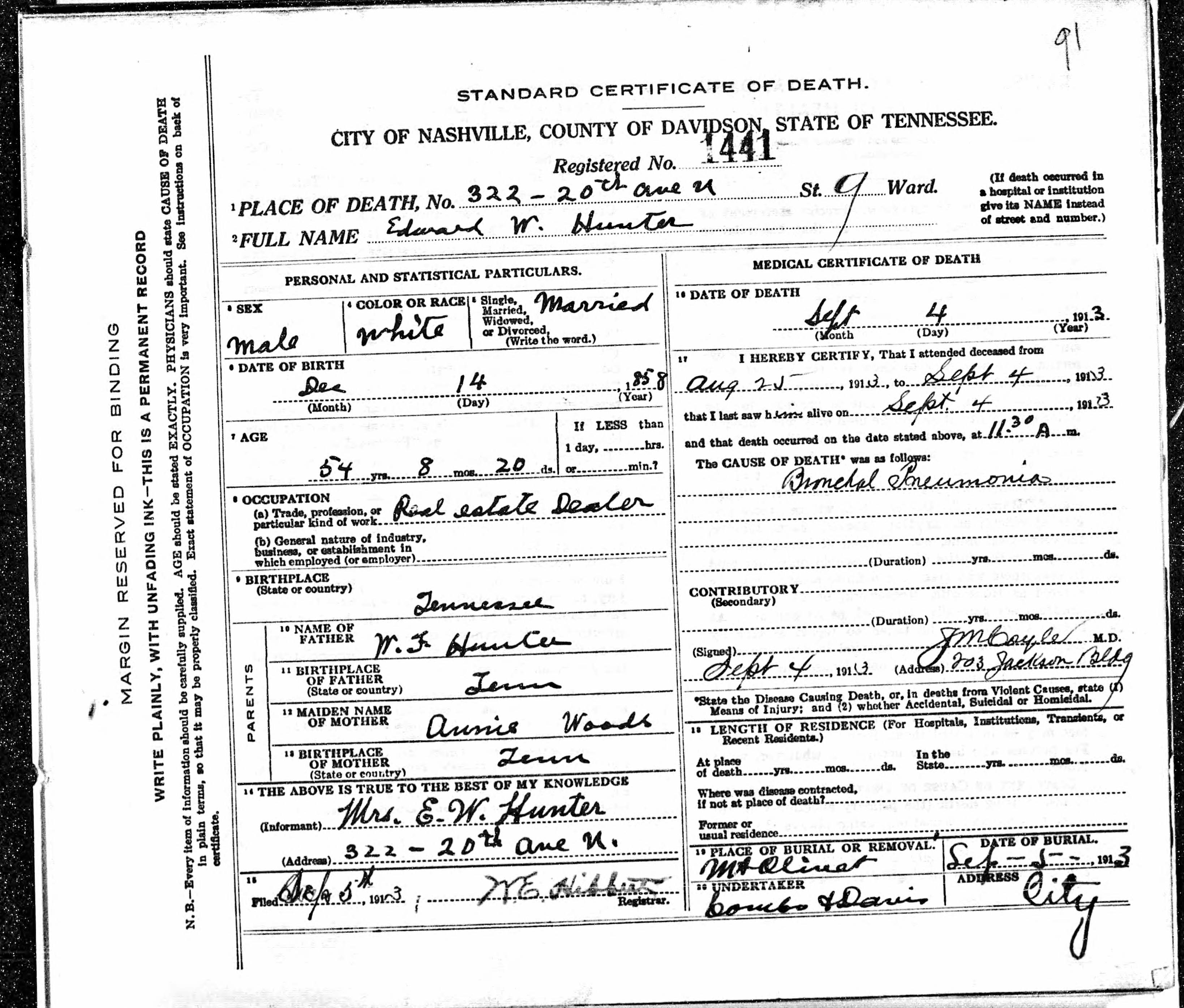 Certificate of Death - City of Nashville, County of Davidson, State of Tennessee