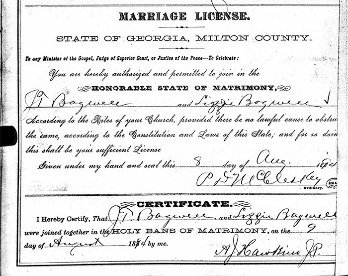 John Tilmon Bagwell and Lizzie Magnolia Bagwell - Marriage License