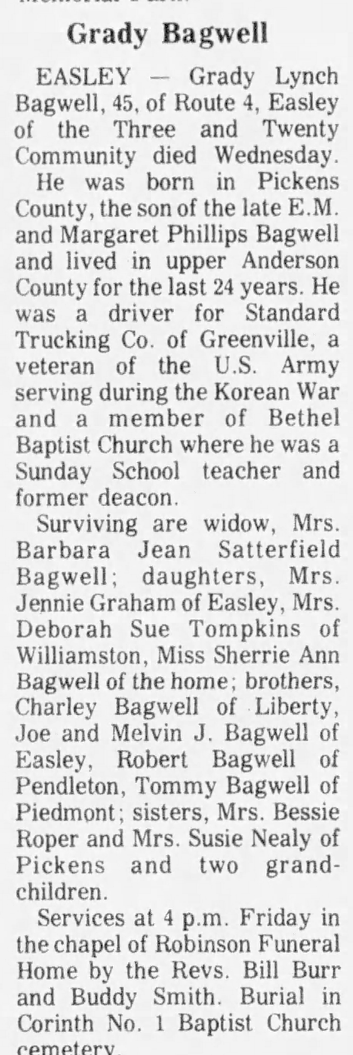 Grady Lynch Bagwell - Obituary