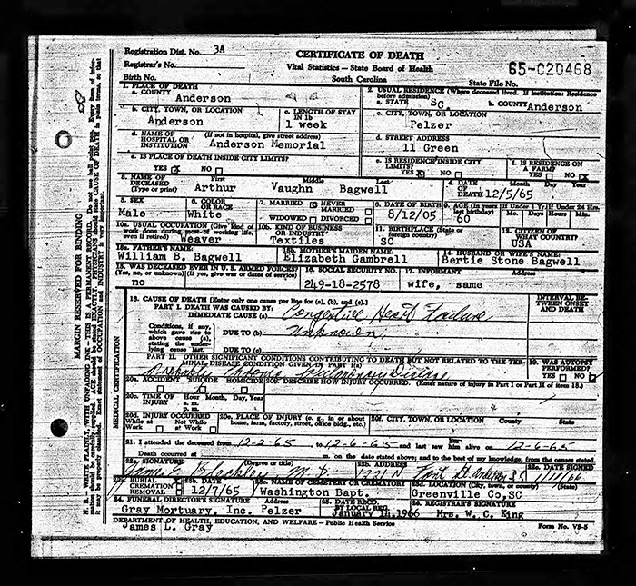 Certificate of Death - State of South Carolina
