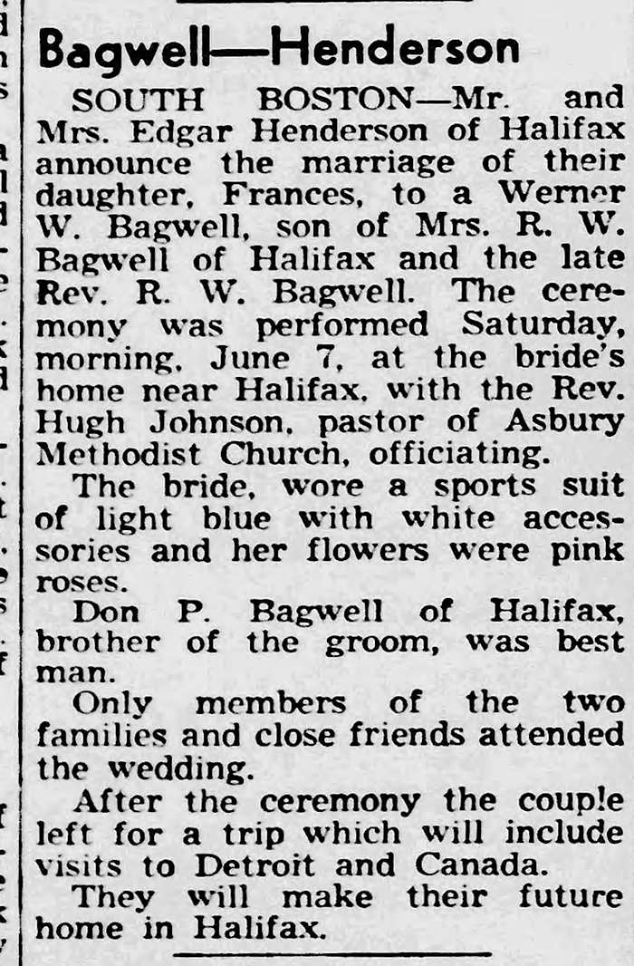 Werner Wright Bagwell and Frances Odell Henderson - Marriage Annoucement